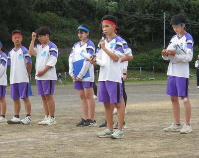☆10月2日(木)、いよいよ体育の部に向けて、全体練習がスタートしました。対中祭スローガンは『結~つながる絆~』です。生徒会長が次のようにみんなに言いました。「私が1(ワン)・2(ツー)・3(スリー)と、言ったら絆!と続いてください。」、「みんなの絆を深めるためです。」みんなの笑顔がはじける最高の瞬間です。