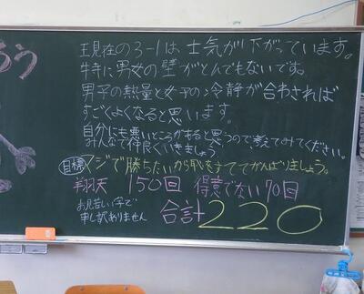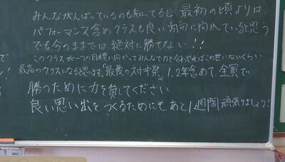 ☆朝、黒板に次のような書き込みがありました。各ブロック長からのみんなへのメッセージです。前日の練習終了後にブロック長から、「どうしても伝えたいことがあるから黒板に書かせてほしい」と担任に申し出があったそうです。