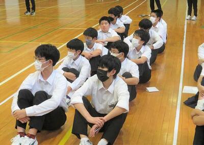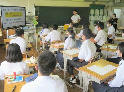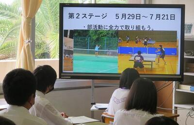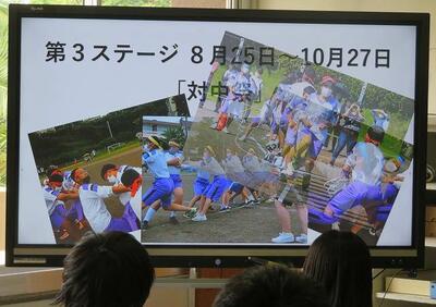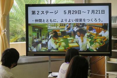 ☆第3ステージ集会がリモートで開催されました。まずは、『仲間と関わり全力を尽くした第2ステージ』の振り返りがなされました。部活働や授業で高まった様子がスライドで紹介されました。