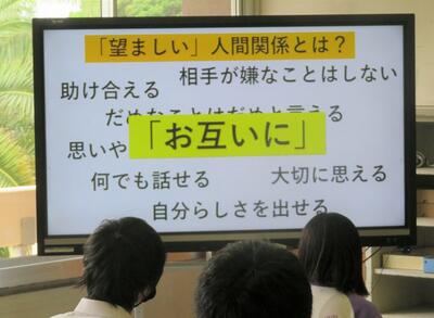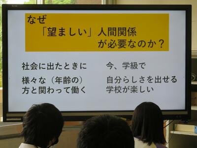 ☆第3ステージの目標『望ましい人間関係をつくる』が示されました。望ましい人間関係とはどんな関係なのか、なぜそのような関係が必要なのかが問われ、自分で考えた後にスライドで説明がありました。
