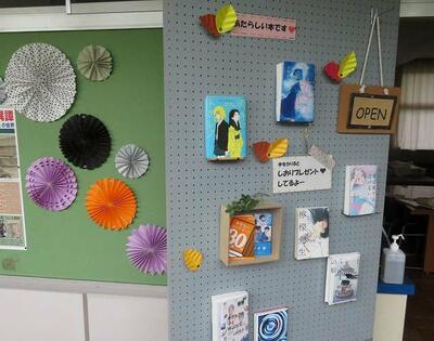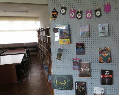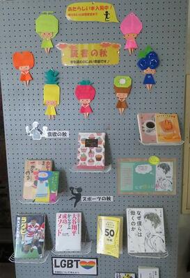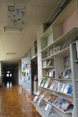 ☆図書室に行くと、図書室が秋の装いにチェンジしていました。生徒も思わず図書館に来室し、本を手にとりたくなります。また、生徒手作りの図書館の看板が廊下の天井から吊り下げられました。遠く空でもバッチリ見えますね。