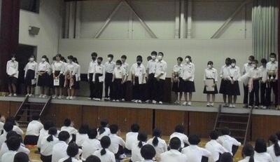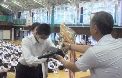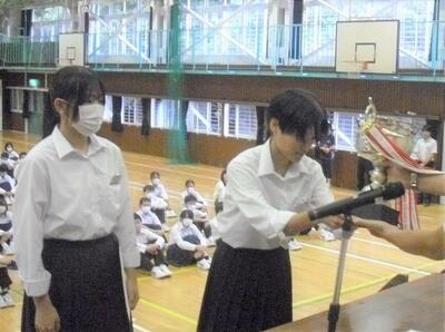 ☆表彰集会が開かれました。夏の中体連や按針祭大会、コンクール等で上位入賞を果たした9チーム、5個人、6ペアが表彰されました。日頃より対中3原則『時を守り、場を清め、礼を正す』を意識して活動している対中生の努力が実を結んだ結果です。