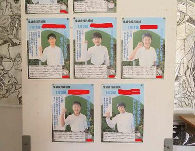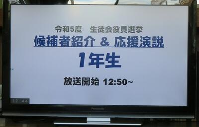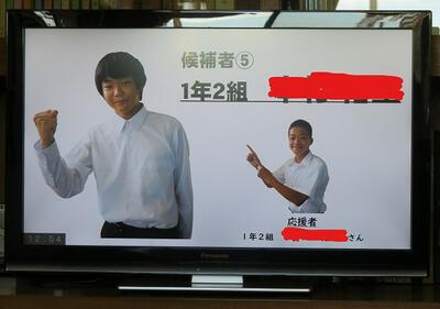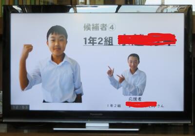 ☆給食の時間に、学年選挙を勝ち抜いた1年生の候補者の応援演説がリモートで流されました。応援者は、元児童会長や学級委員としての実績や、的確な指示をみんなに出せるところ、周りに気を配れるところ、授業でも積極的に自分の考えを述べているとこなど応援する候補者の素晴らしいところを熱く語ってくれました。玄関の掲示板には候補者が掲げる公約が書かれた選挙ポスターも貼られています。どの候補者も頼もしいです。