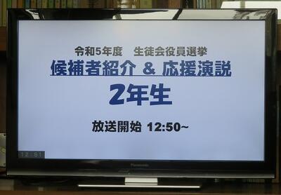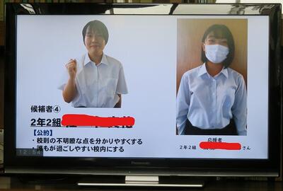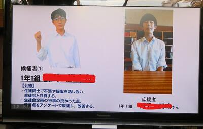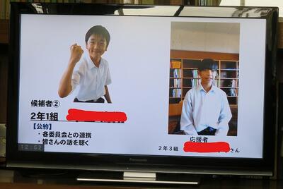 ☆2年生は、各教室からリモートで各候補者の演説を聴きました。「突然ですが、みなさん、自分の良さを何ですか。近くの人と言い合ってください。」観衆を巻き込むテクニックを用いる候補者もいて、さすが2年生と関心させられました。
