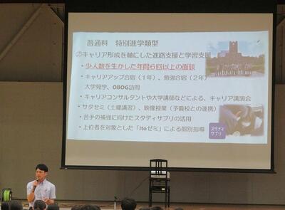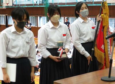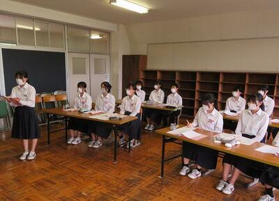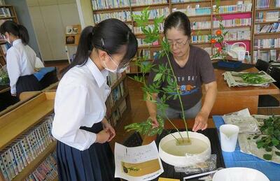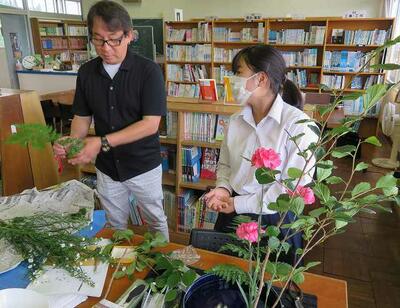 ☆華道家いけばな龍生派の西脇玉龍先生をお招きして、第1回の『生け花し隊』を開催しました。希望した6名の生徒が西脇ご夫妻に教えていただきながら、生け花にチャレンジしました。基本の真・副・体を伝授してもらい、感性を働かせながら思い思いに表現していきました。先生にアドバイスをもらい、素敵な作品が完成しました。各階に飾ると、校内の空気が変わりました。月曜日、みんなが見たらびっくりするでしょうね。西脇先生、ありがとうございました。