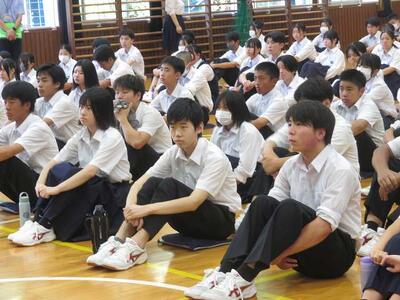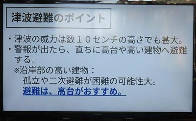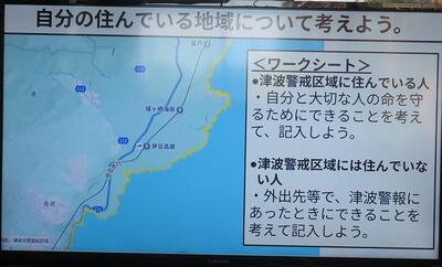 ☆防災訓練では、避難時の合い言葉『おかしも』の確認、避難経路の確認、点呼訓練が行われました。どの生徒も真剣に取り組み、合格点でした。教室に戻り、防災学習を実施しました。今回のテーマは津波発生のメカニズムと避難のポイントでした。