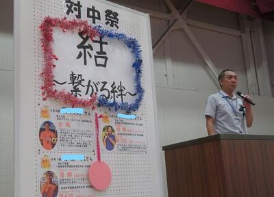 ☆6月20日のブロック決め集会、7月2日のスローガン発表に続き、本日、22日(火)に、対中祭のテーマソングが『ともに』(WANIMA)に決定されたことが発表されました。同時に、ブロック長、クッパが登壇し、担当の学習委員長から今年度のシンボルマークの図案も発表され大いに盛り上がりました。明日からの夏休み、各係が本格的な準備に入ります。対中祭、ワクワクします。