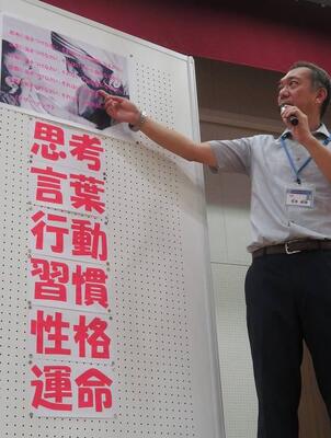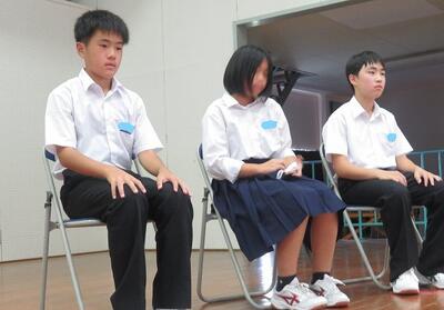 ☆各学年の代表生徒のスピーチでは、「人は物に感謝する2学期にしたい。そのために1日5回以上ありがとうと言いいます」「宿題を終えるまでゲームをしないルールを作ります」「部長として不安もあるが、先輩として、プレーヤーとして成長したい。」「夏休みは苦手な教科に力を入れ、得意教科に近づけることができた。」「最後の対中祭、合唱の指揮やブロックの応援合戦に100%の力を出し切って楽しみたい。」と熱い思いを発表してくれました。