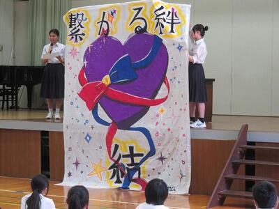 ☆8月26日(火)、2学期の始業式が行われました。校長からは、夏休みに地域のイベントスタッフとして参加した生徒や地域のイベントに参加した美術部員、対中祭の準備のために来校した生徒の『自分からやる』を実践した姿が紹介されました。また、2学期は学校教育目標に迫る大きなチャンス『対中祭』があり、全員でスローガン『結(ゆい)~繋がる絆~』を達成し、自分や仲間の良さを大いに見つけてほしい、そのためにはみんなでマザーテレサの言葉を意識することが必要だと話された。