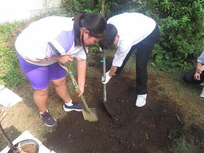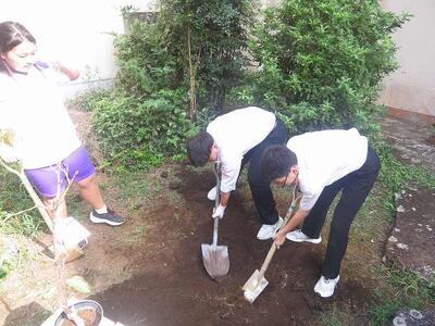 ☆2年生がこのたび、卒業生の熱い思いが詰まった桜を受け継ぎました。2年生の総合的な学習(株)Tajimaの中庭部が手をあげました。中庭を生徒の憩いの場にしたいと活動する中庭部です。この桜が大きく成長し、対受検の受検のシンボルになることを願っているようです。