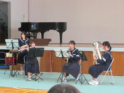 ☆12月9日(土)、体育館で吹奏楽アンサンブルコンテストに向けてのお披露目会が開かれました。3年生引退からこれまで、練習を重ねてきた5チームの演奏が披露されました。保護者のみなさま、先生方をはじめ、引退した3年生もかけつけてくれました。心癒やされる昼のひととき、とても温かな雰囲気に包まれてのお披露目会でした。