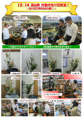 ☆12月14日(木)、西脇玉龍先生をお招きしての第6回の校内を彩り隊(生け花教室)が開催されました。今回は、生徒4名と職員2名の計6名でいけました。明日から教育相談がスタートします。クリスマスバージョンで素敵に彩りました。