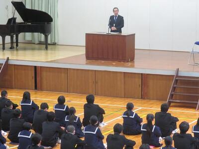 ☆1月6日(火)3学期の始業式が執り行われました。校長式辞では、3学期49日間で今年度の対島中の合い言葉『自分からやる!』をみんなが実行して生徒会目標で掲げられた『ココロオドル対島中』を創り上げようと話され、生徒アンケートから、今年度、対中生が自分からやった事例や、正月の箱根駅伝からのエピソードが紹介された。