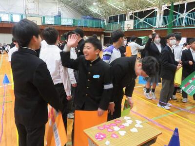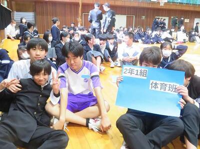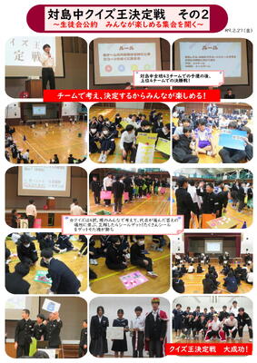 ☆さあ、当日の『対島クイズ王決定戦』はどうだったでしょうか。みんなが楽しめるために生徒会がこだわった、班対抗戦、クイズの内容、シンプルな4択とシールゲット方式、生徒会のねらい通り、会場は大盛り上がり、生徒も先生も全員が楽しめました。この集会が大成功を収めたのは、生徒会執行部が準備から当日の運営まで、自分たちで考え、全てを楽しんでいたこと、そして出来上がった動画のクオリティーの高さはもちろんのこと、この集会にかける生徒会の熱い思いが全校生徒に伝わり、全員が楽しもうと思って集会に参加したからです。これが対島中の自治力です。